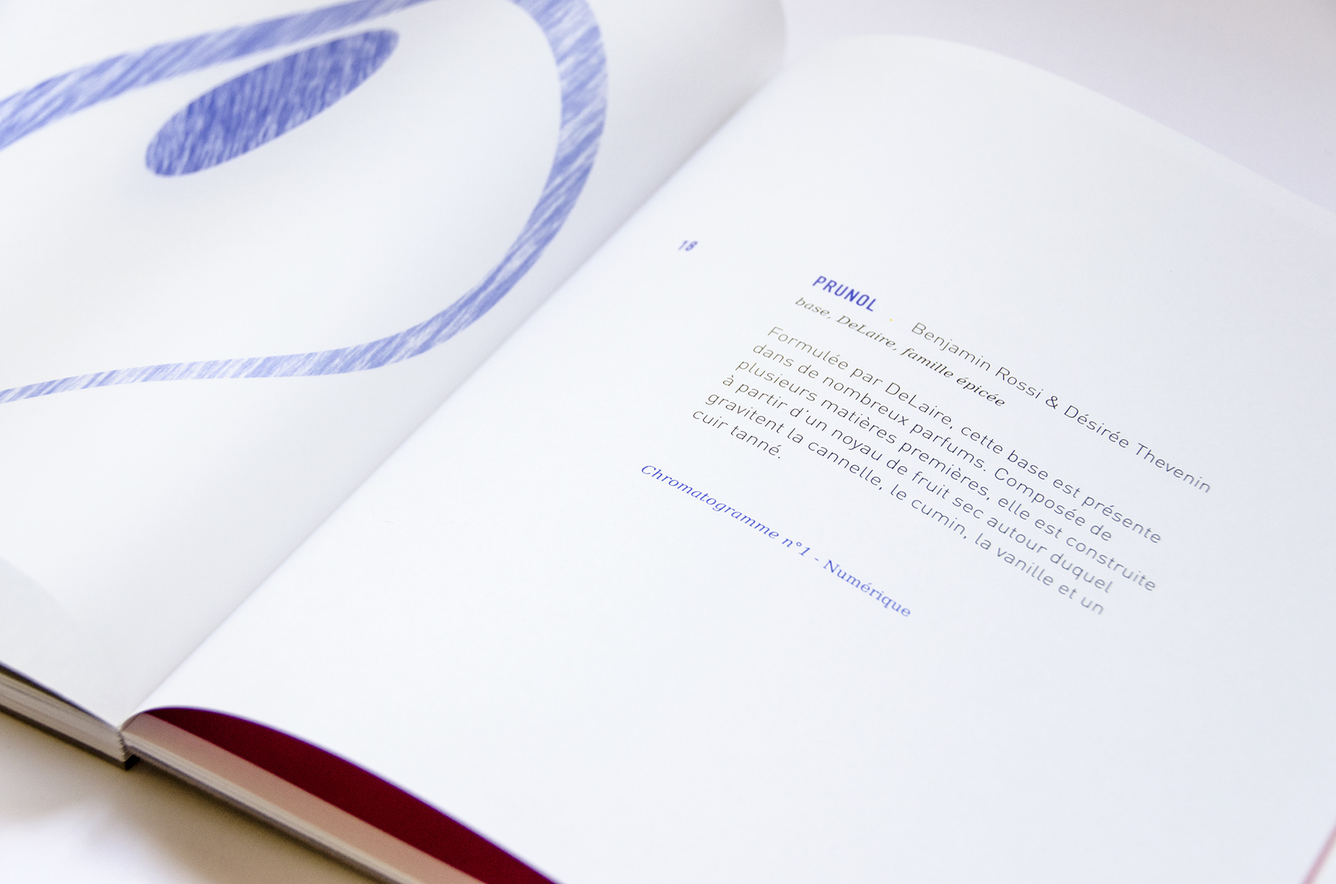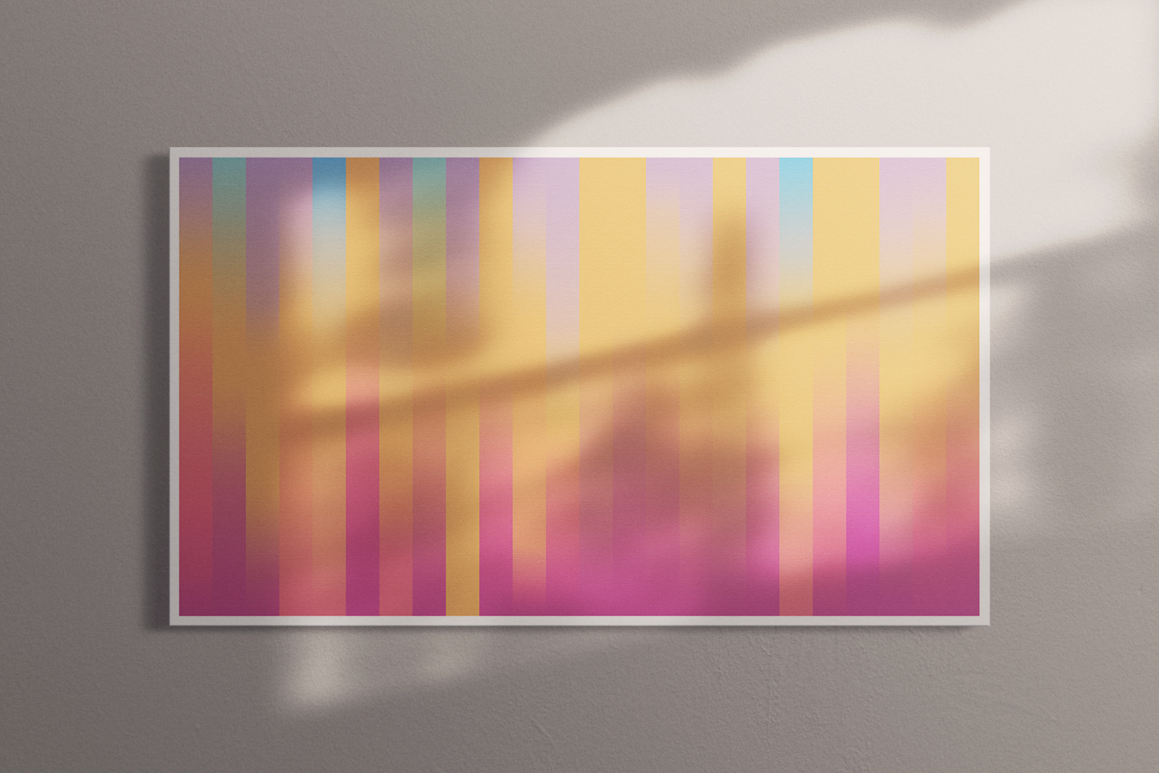 Benjamin Rossi et moi-même avons traduit visuellement une expérience sensorielle menée sur vingt-quatre heures. Chaque bande verticale traduit une heure d’observation : un glissement de teinte pour une évolution d’odeur. Les couleurs se succèdent comme des impressions sensorielles (chaudes, diffuses, parfois incertaines) jusqu’à former une composition abstraite, presque atmosphérique. Au centre, une ligne floue émerge : la mémoire visuelle de la matière première, comme un parfum qui persiste après l’expérience.